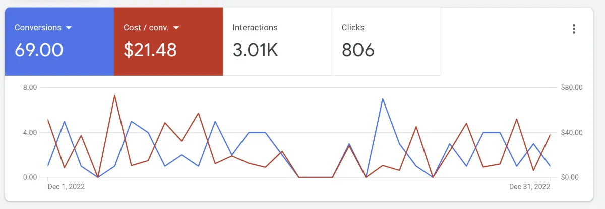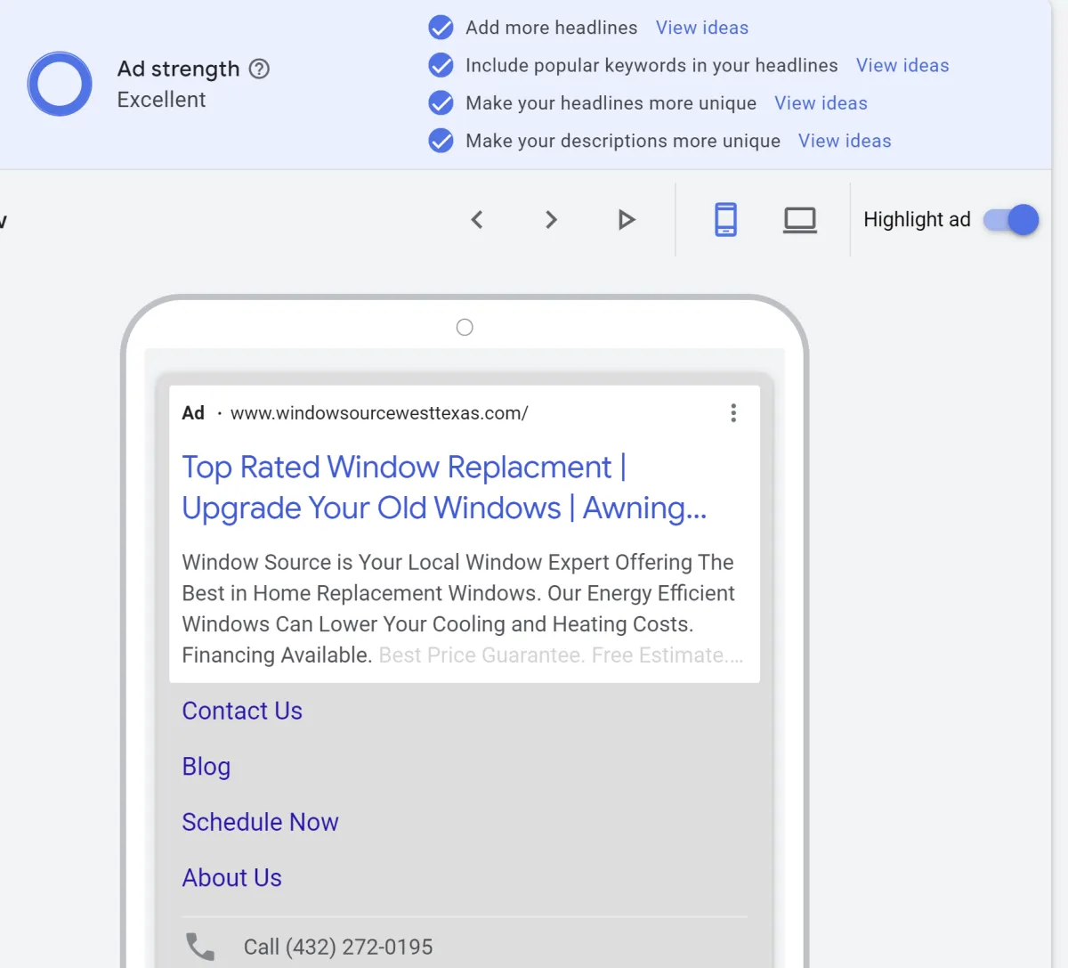 Each Ad is dynamic; meaning I allow Google to piece together an Ad based on a list of 15 Headlines and 4 Descriptions I provide. This allows us to test what Headline and Description perform the best for each customer search.